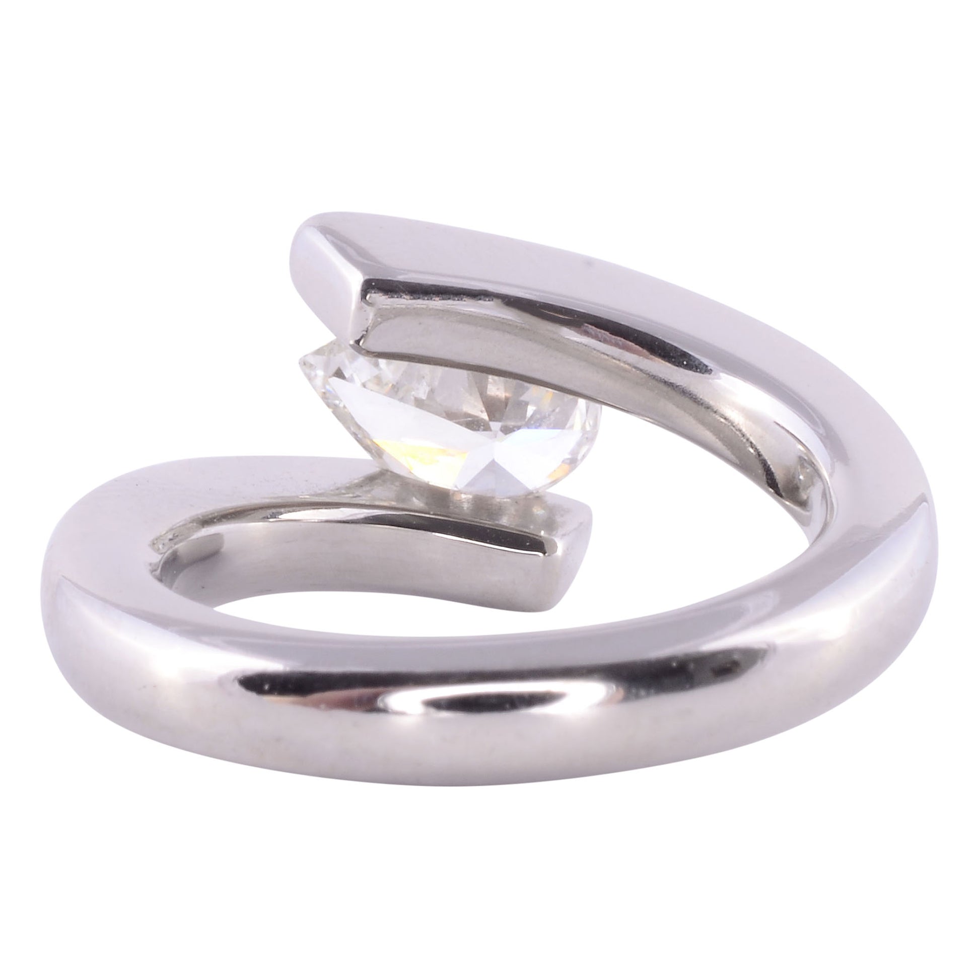 Estate signed Steven Kretchmer 1.00 Carat VS1 pear brilliant diamond platinum helix engagement ring, circa 1990. This helix platinum ring signed by designer Steven Kretchmer features a floating pear brilliant cut diamond at 1.00 carat. The diamond has VS1 clarity and H color. This floating pear diamond engagement ring is a size 5.25 and is appraised at $12,029.