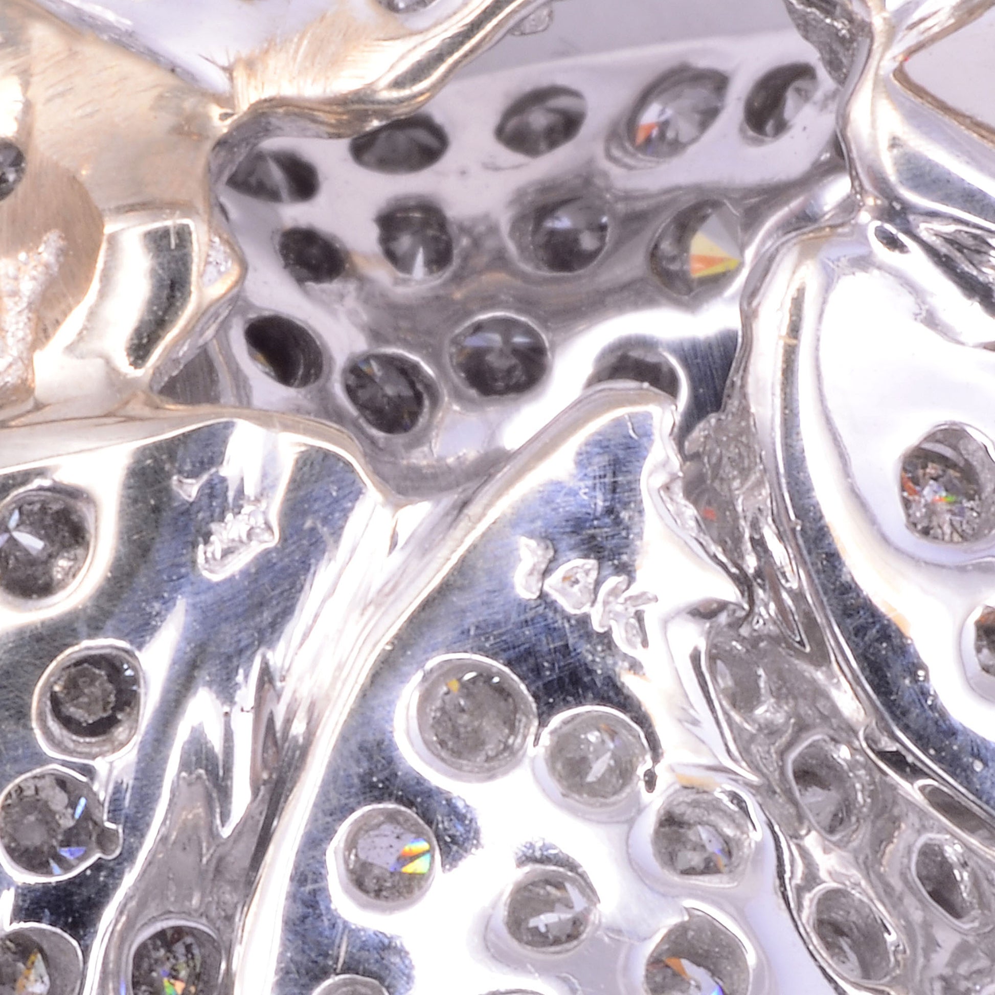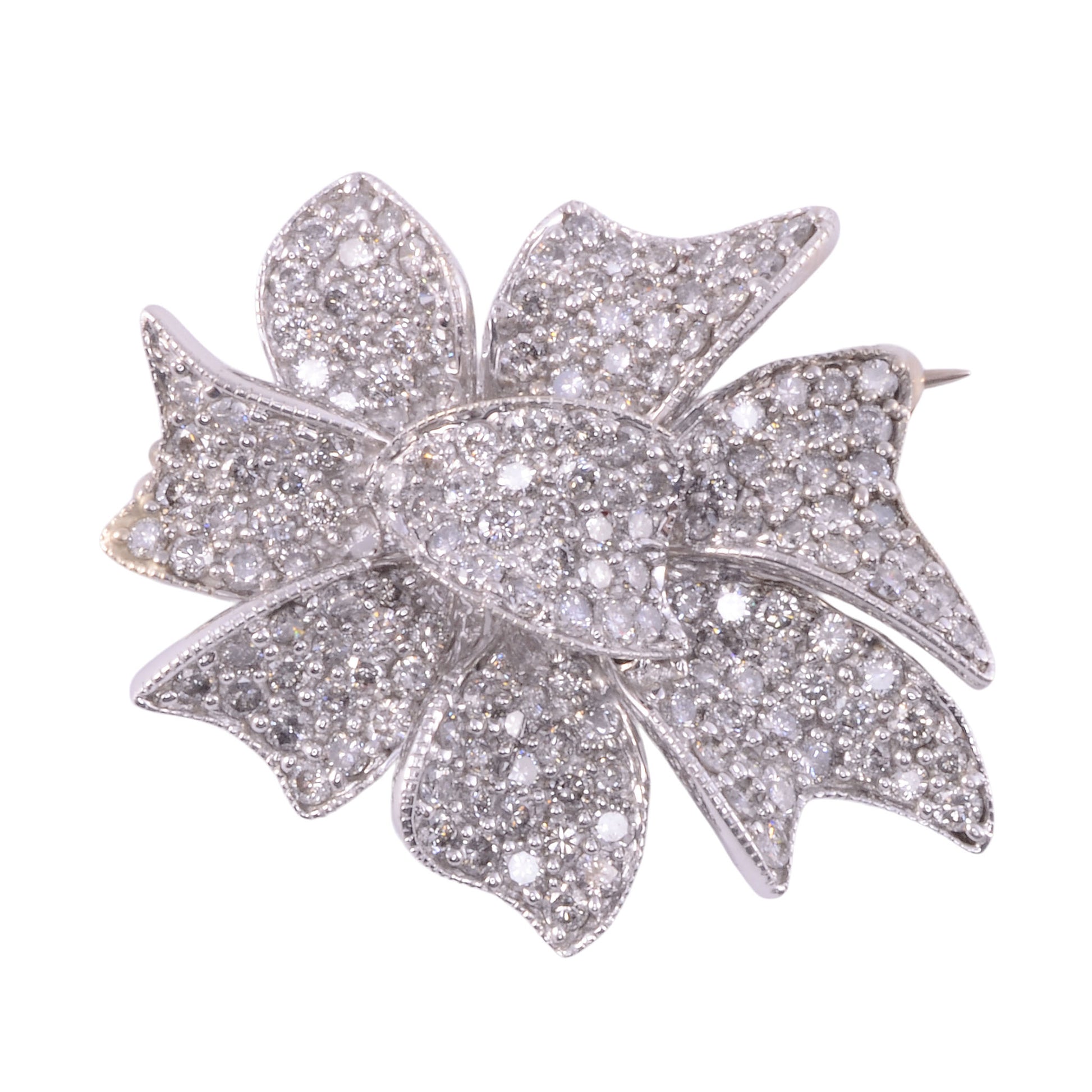 Estate 2.25 CTW pave diamond bow pin. This estate pin is crafted in 14 karat white gold featuring 2.25 carat total weight of pave set diamonds. The diamonds have VS2-SI2 clarity and H-J color, two at I1. This diamond brooch features milgrain detailing. [MHOP KIMH2020P]