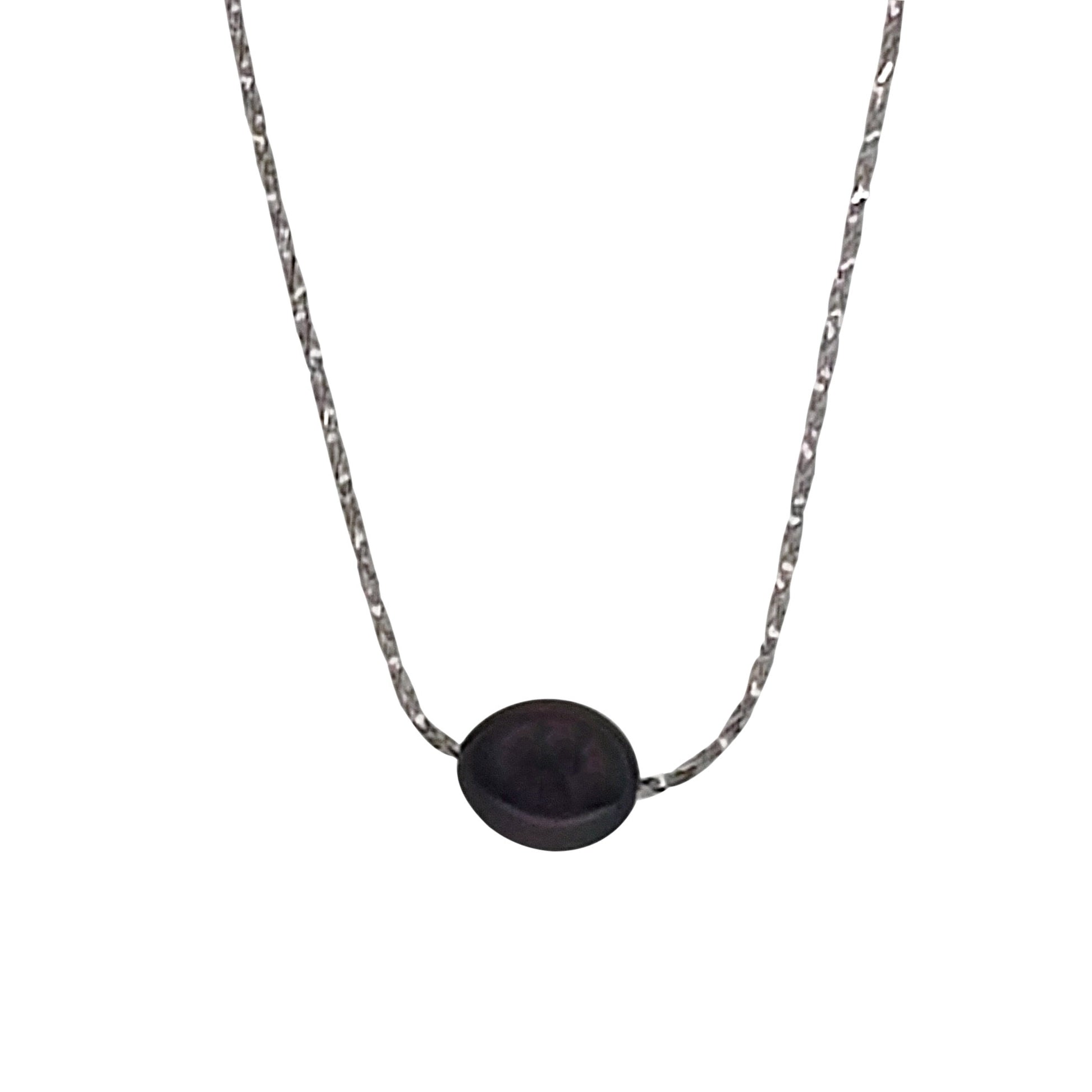 Estate 7-8mm dark gray Tahitian pearl slide 18K white gold necklace. This estate slide necklace is crafted in 18 karat white gold featuring a 7-8mm dark gray Tahitian pearl slide pendant. The necklace is secured with a spring ring clasp marked 18K.