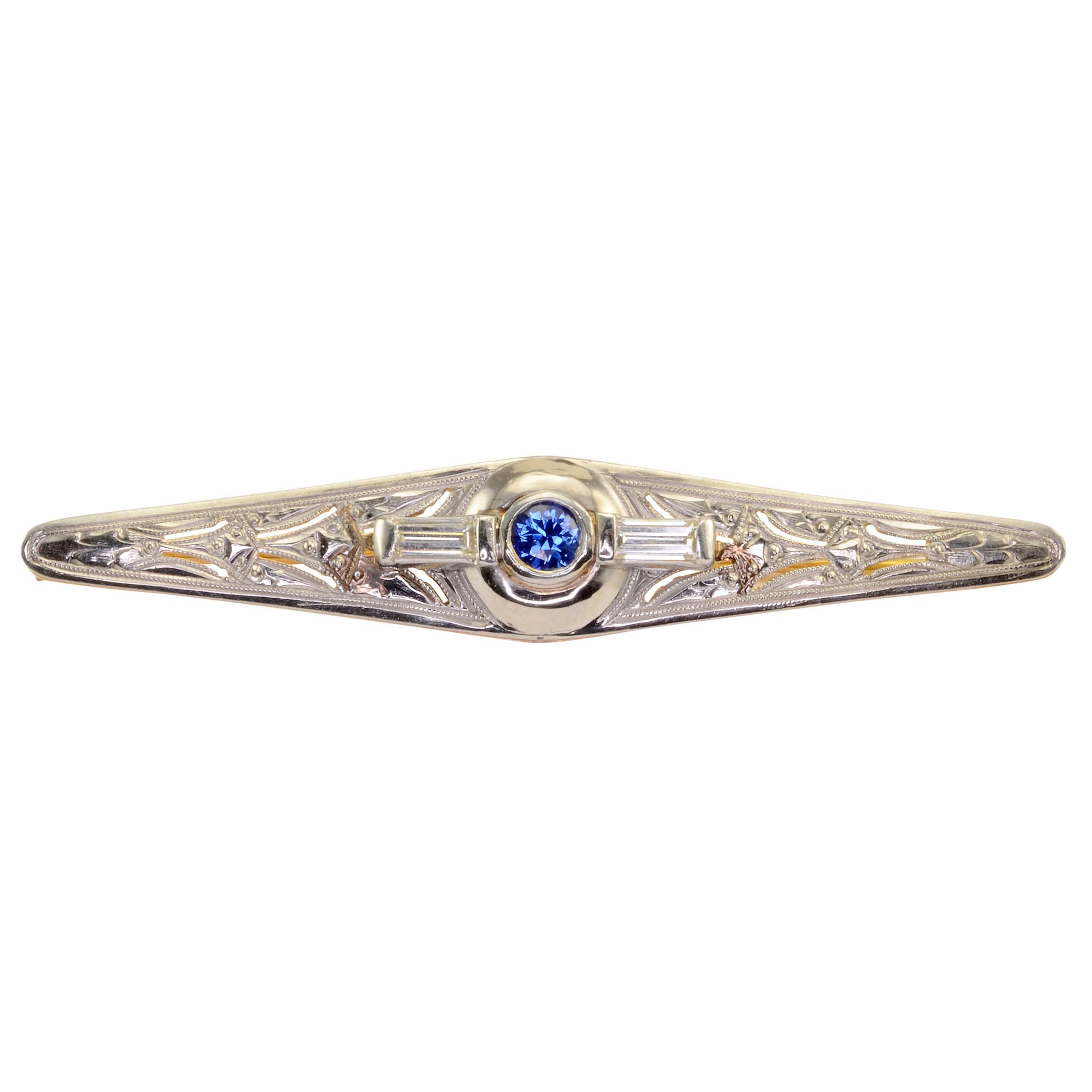 Vintage Art Deco Ceylon sapphire and VVS1 diamond bar pin, circa 1930. This Art Deco pin has one center 0.26 carat Ceylon sapphire and two baguette diamonds at 0.25 carat total weight VVS1 clarity H color. The sapphire and diamond bar pin is created in platinum and 14 karat yellow gold. This Art Deco bar pin is appraised at $3,500.
