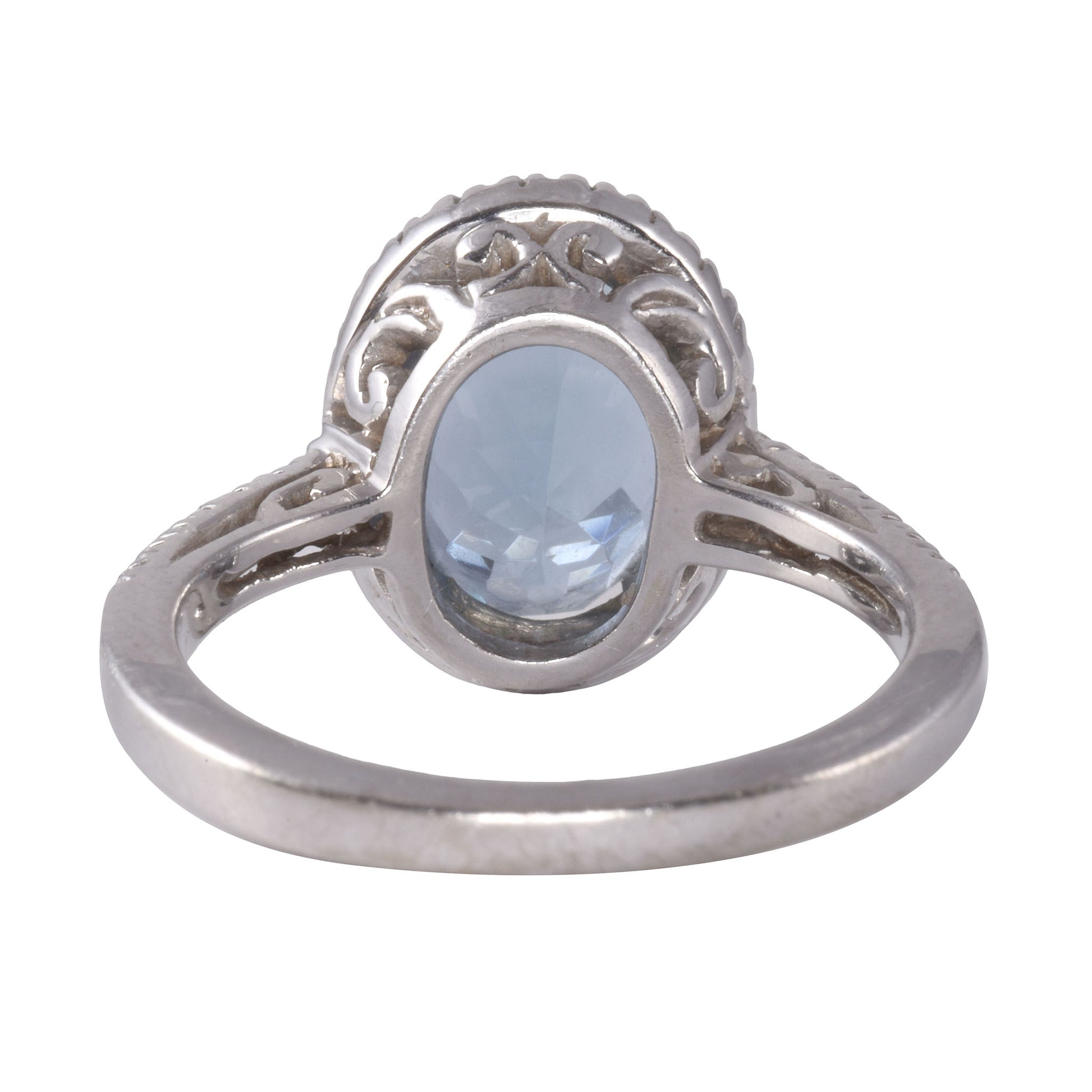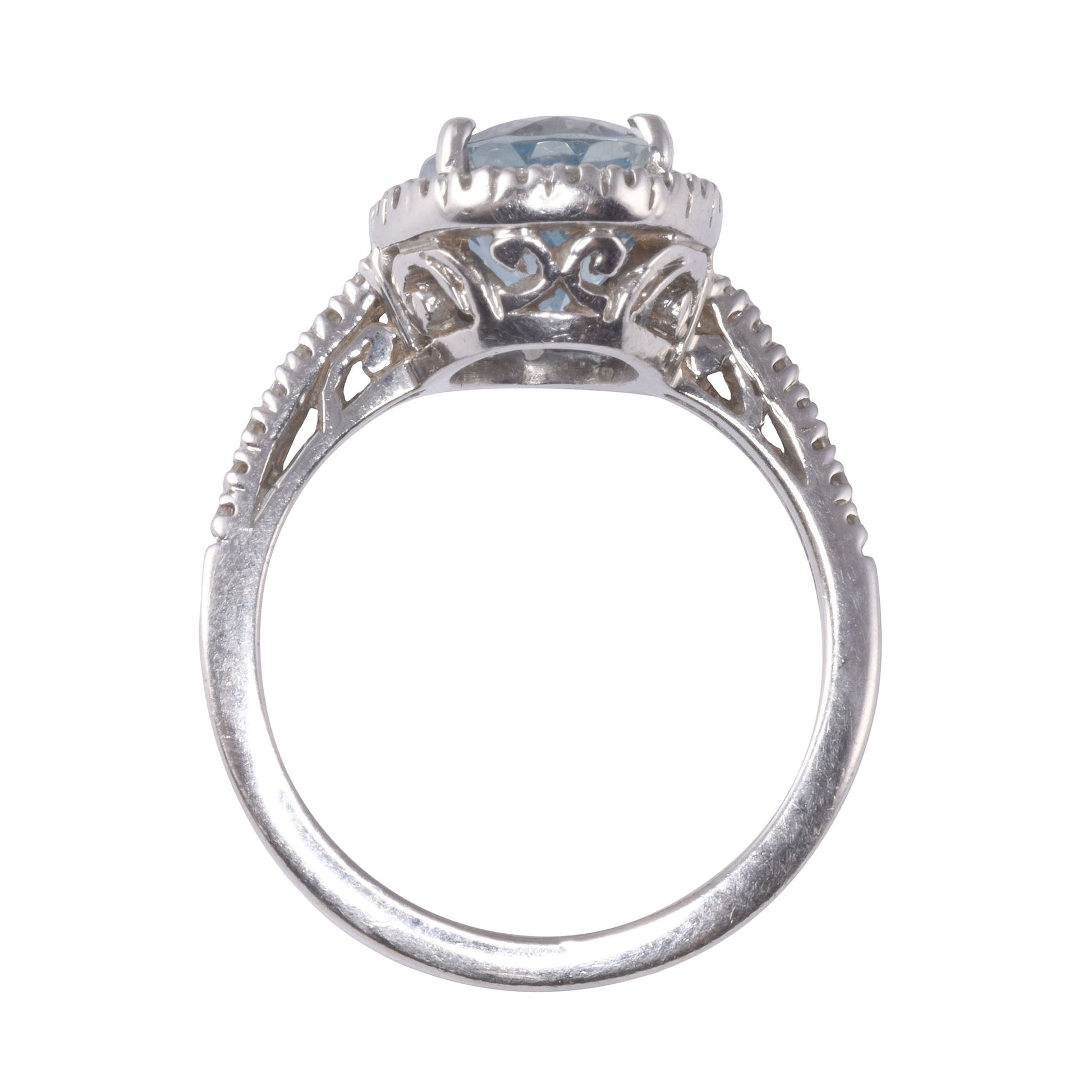Estate diamond halo aquamarine ring. This 14 karat white gold ring features a 2.75 carat oval aquamarine center with very nice quality. It is accented with .48 carat total weight of diamonds having VS-SI clarity and G-H color. The white gold mounting and gallery are nice quality. This aquamarine ring is a size 6.25.