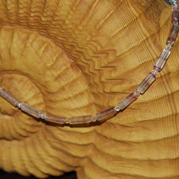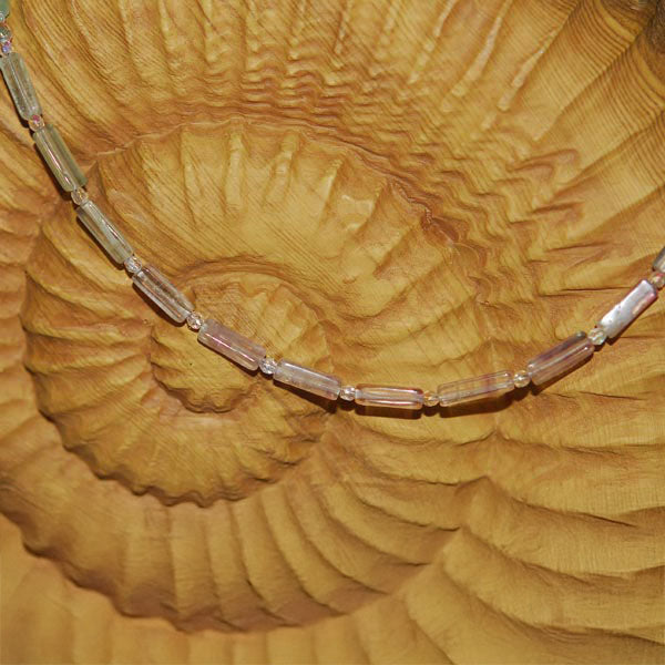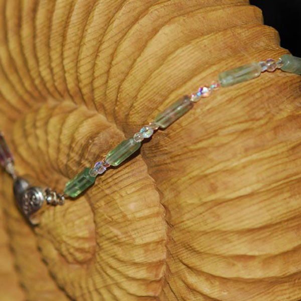 Fluorite Rainbow bar necklace accented with Czech fire polished iridescent glass beads finished with a heavy sterling silver half filigree heart focal clasp, 18-1/2” length, ¾” heart clasp. This necklace highlights the beauty of Rainbow Fluorite going from an intense purple, fading to light, then around to a beautiful green hue. Delivered in a lovely gift box via Insured Mail. Matching earrings are sold separately. Please inquire with seller.