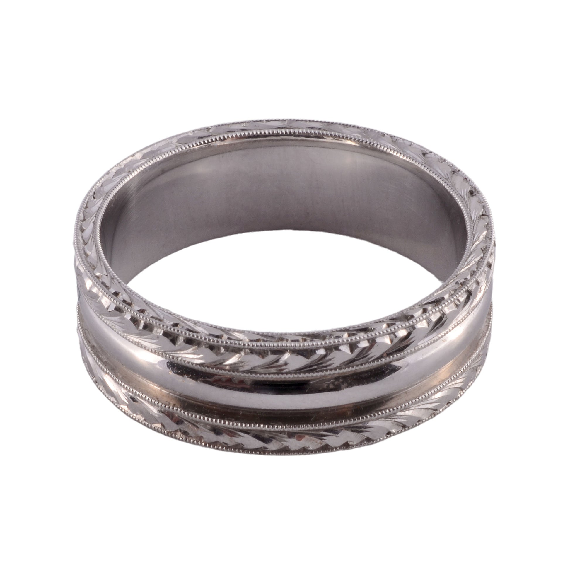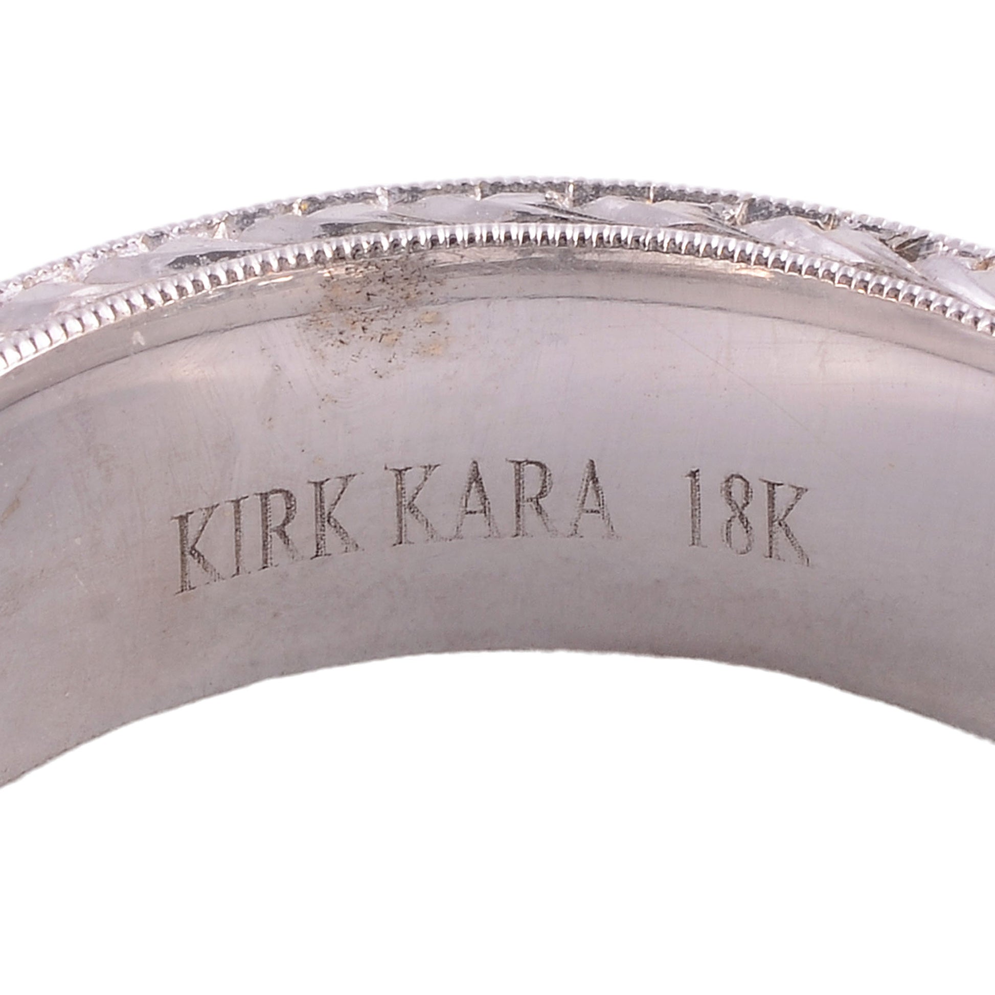 Estate Kirk Kara 18 karat white gold wedding band. This fine wedding band features deep chase work and hand engraving with excellent workmanship. The stunning Kirk Kara wedding band is a domed style with an engraved and milgrain edge. His signature wheat engraving adorns the edge of this band. This 18KW wedding band is a size 10. The designer wedding band is currently selling new on Kirk Kara's website for $6,430 in this size.