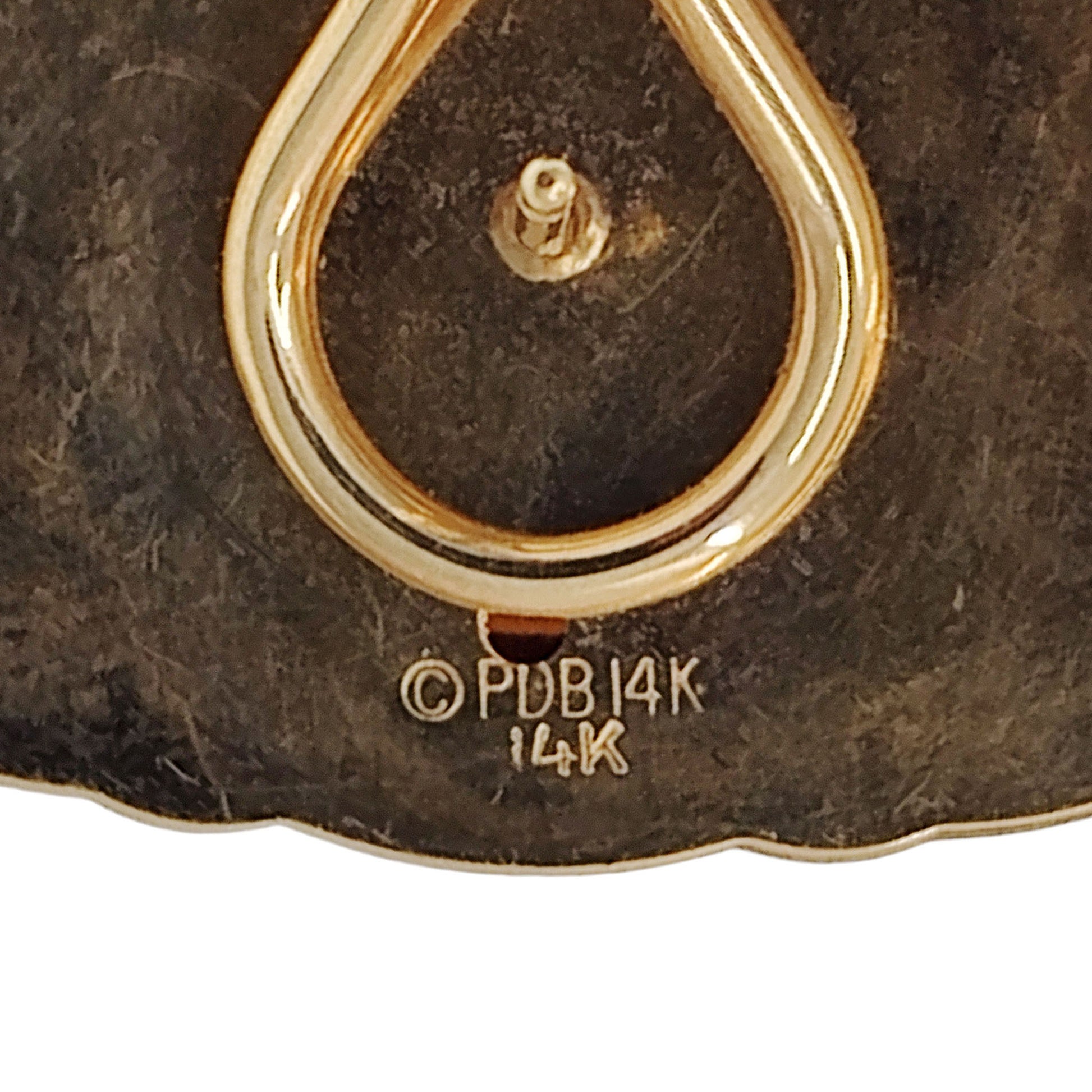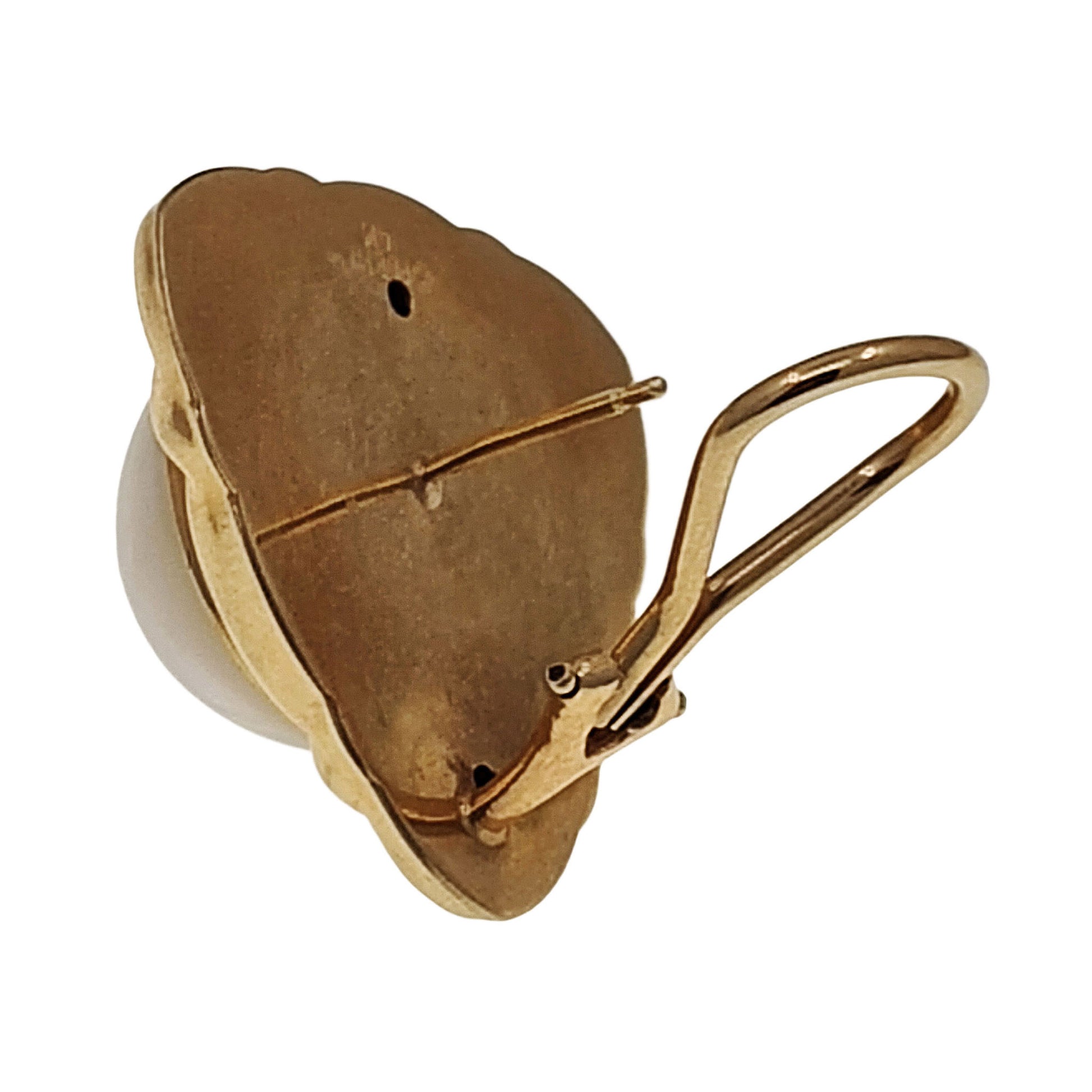 Estate mabe pearl 14K omega back earrings. These earrings feature a stylized triangular shape 14 karat yellow gold base with 14mm mabe pearls and secured with omega backs to ensure the perfect fit. These earrings are professional looking, and can be dressed up or dressed down, making them an excellent, versatile fit for your jewelry wardrobe.