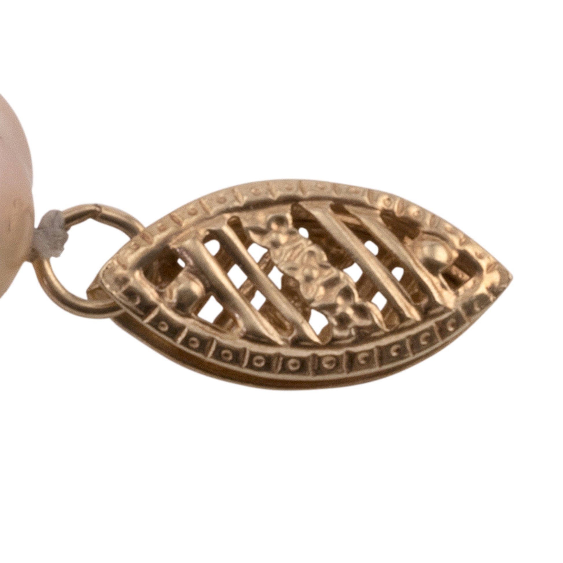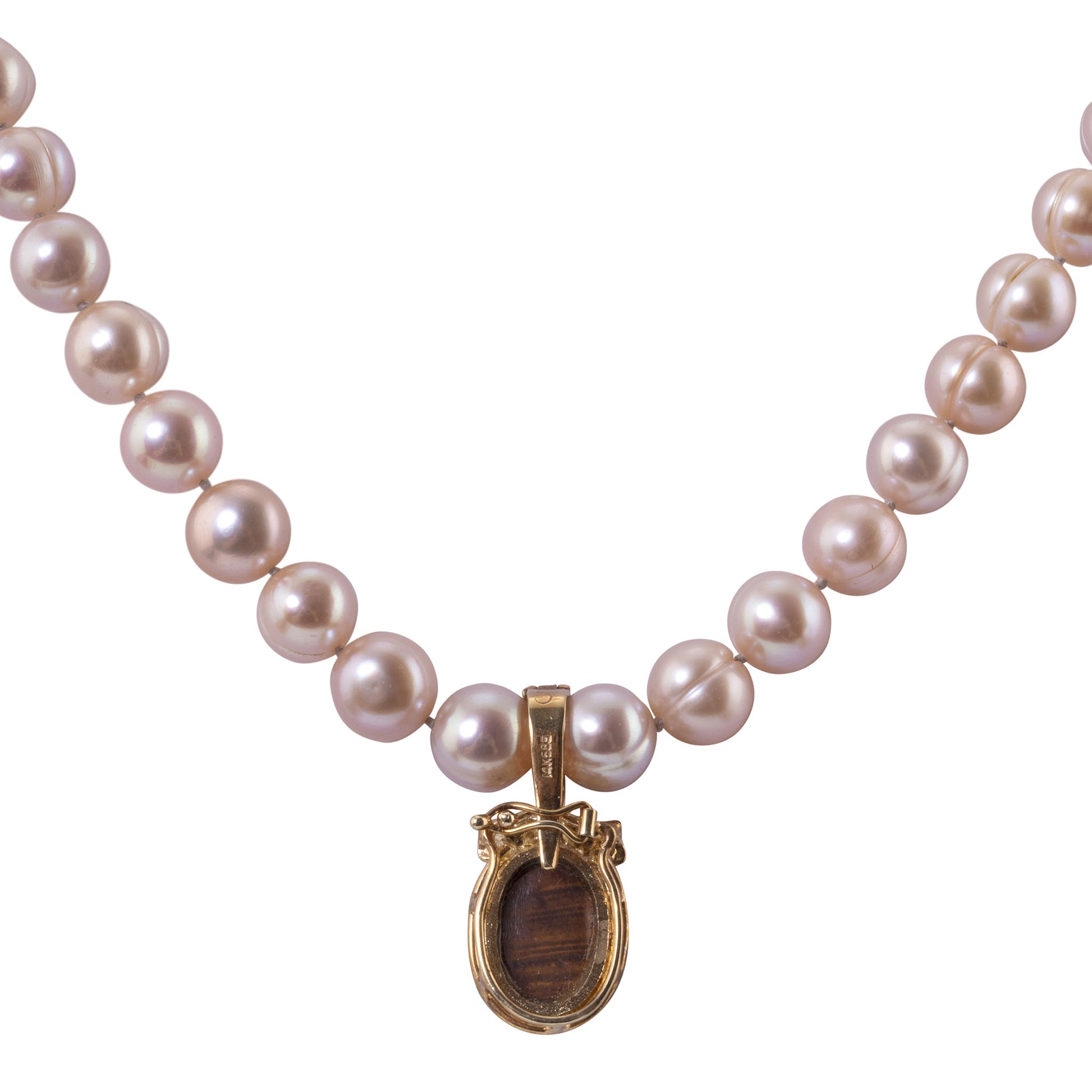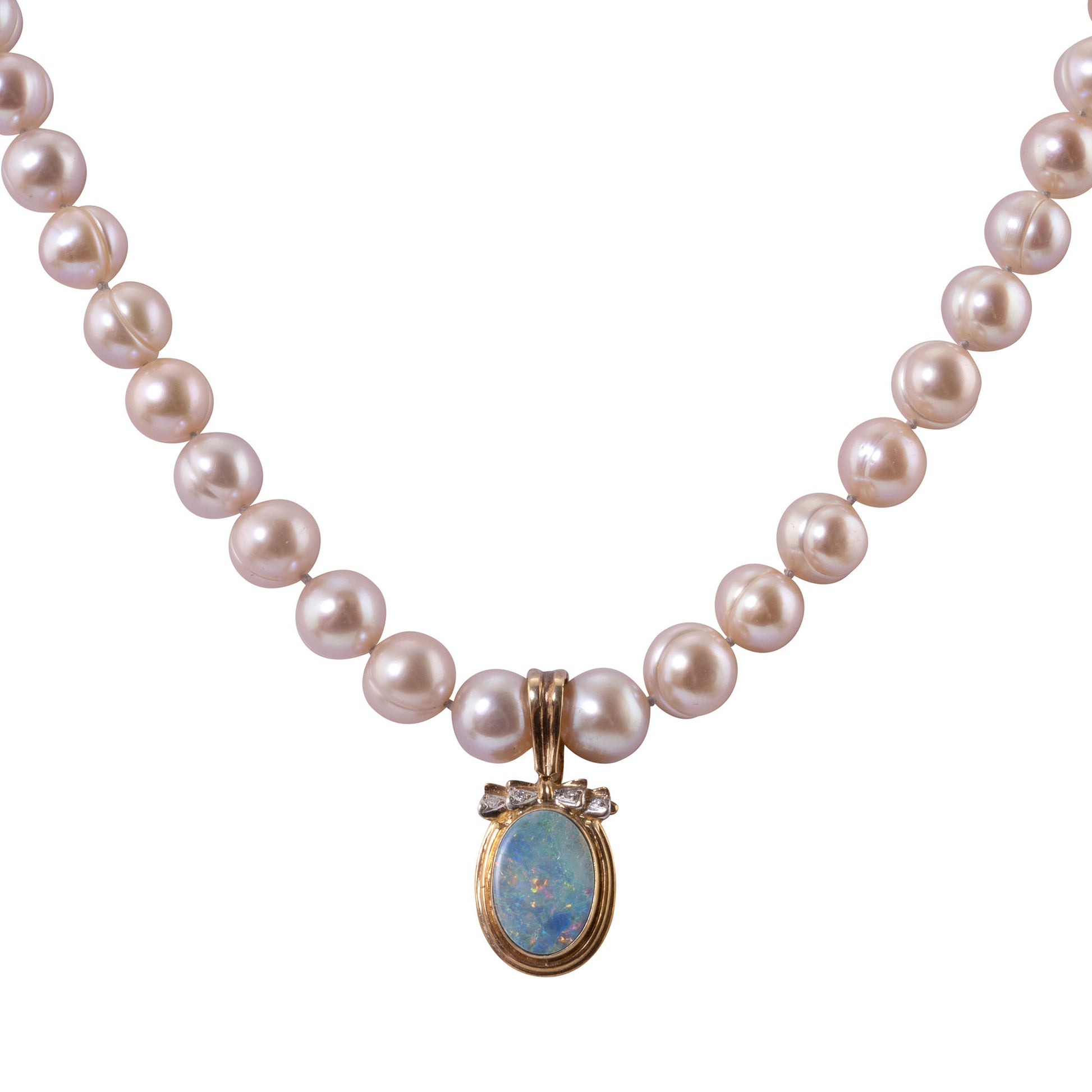 Estate opal enhancer pendant on pearl necklace. This necklace features 50 light rose colored cultured pearls at 8.5mm. The necklace comes with a 14 karat yellow gold enhancer pendant with a 3 carat opal and .08 carat total weight in accent diamonds. [RHAW 48]