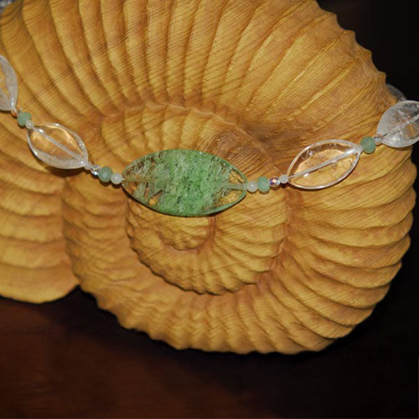 Green and clear marquise faceted moss agate necklace with clear quartz marquise shaped stones, accented with serpentine, faceted aventurine, and Czech fire polished iridescent beads secured with a sterling silver lobster clasp and sterling silver extender chain, measuring 17" to 18-3/4" in length. Matching earrings available. Delivered in a lovely gift box via Insured Priority Mail.