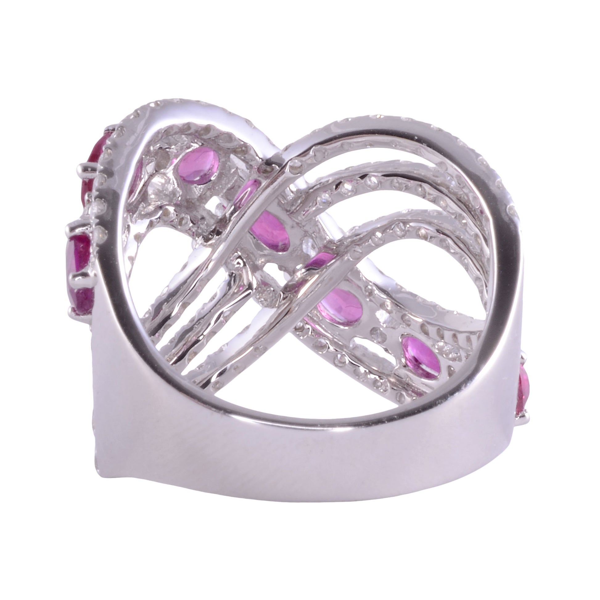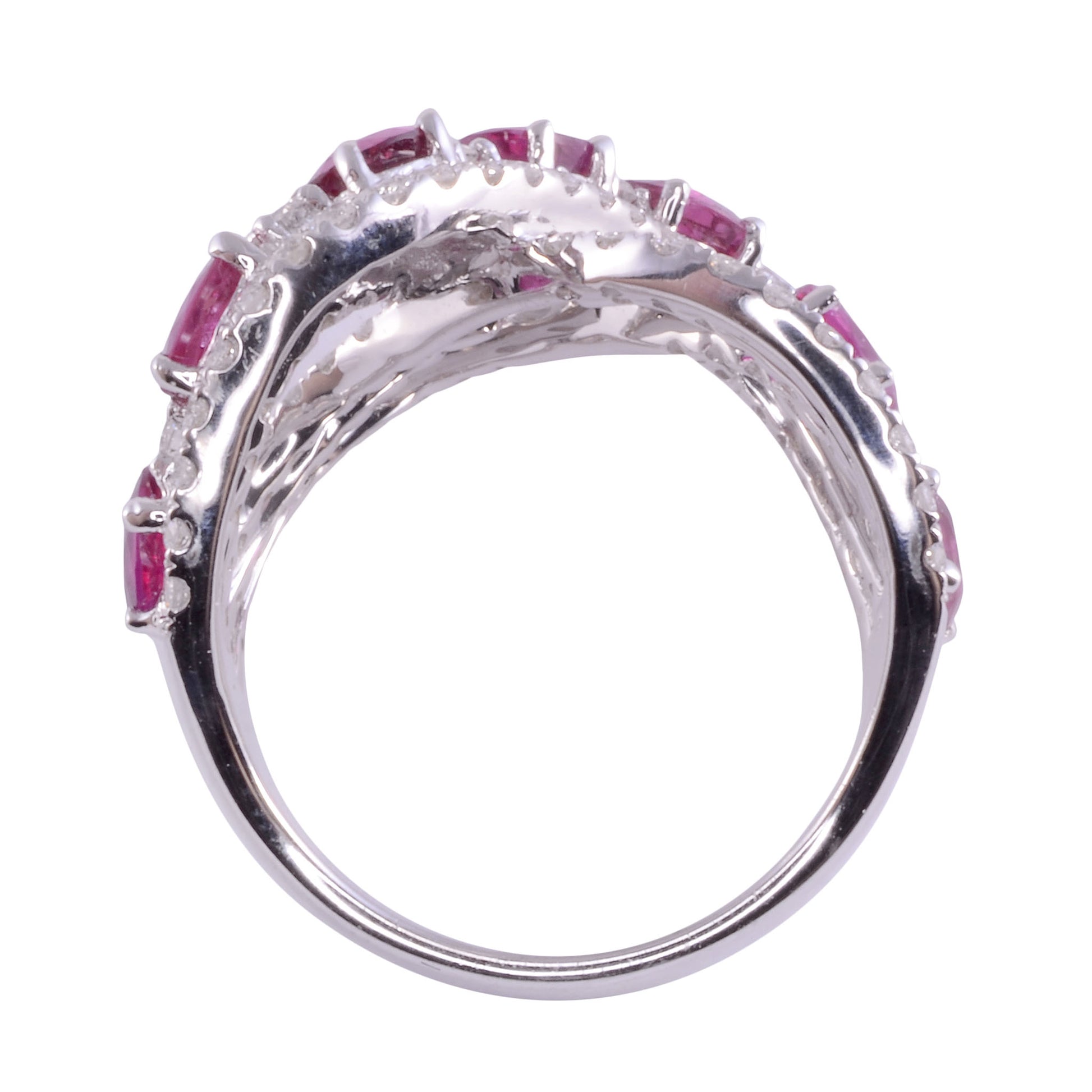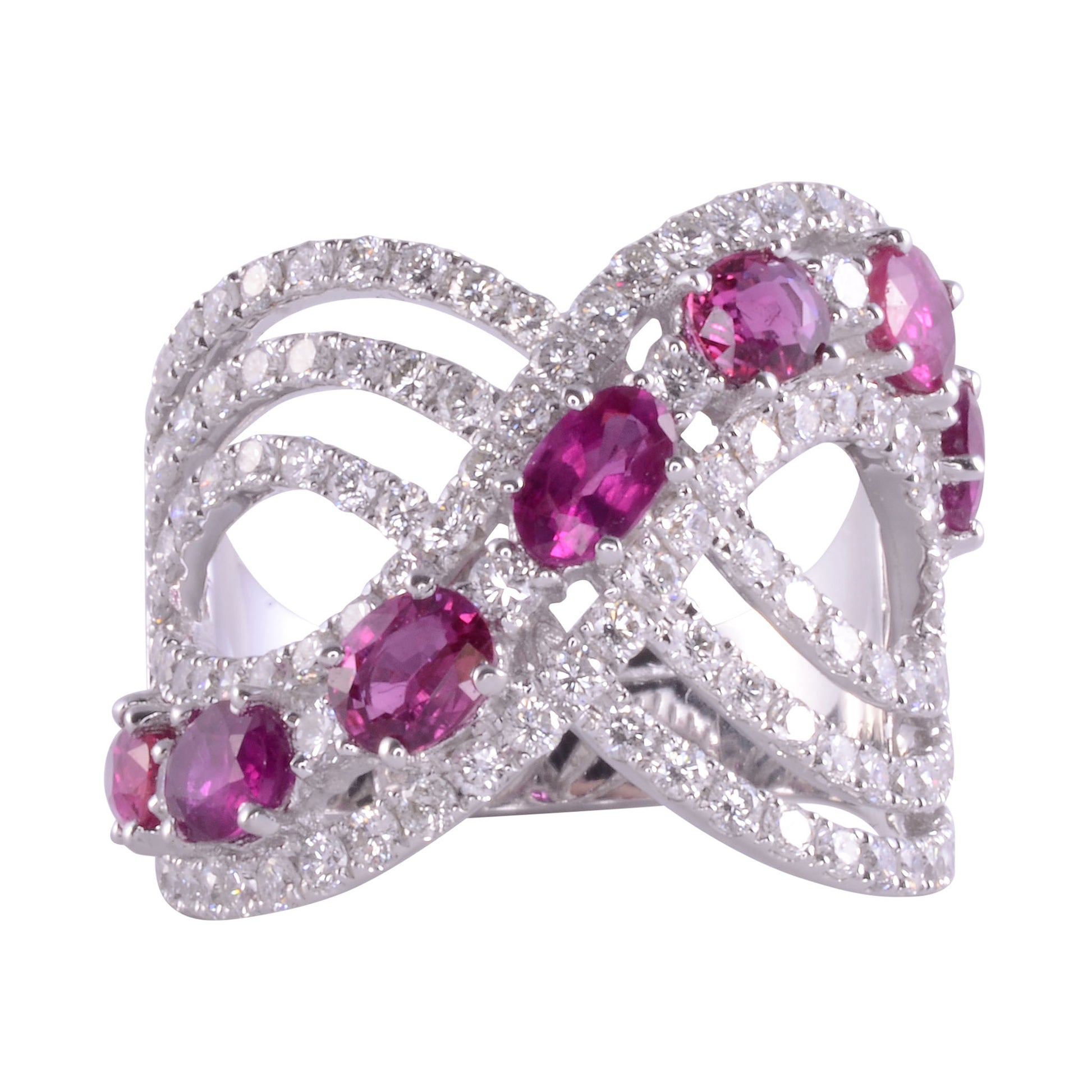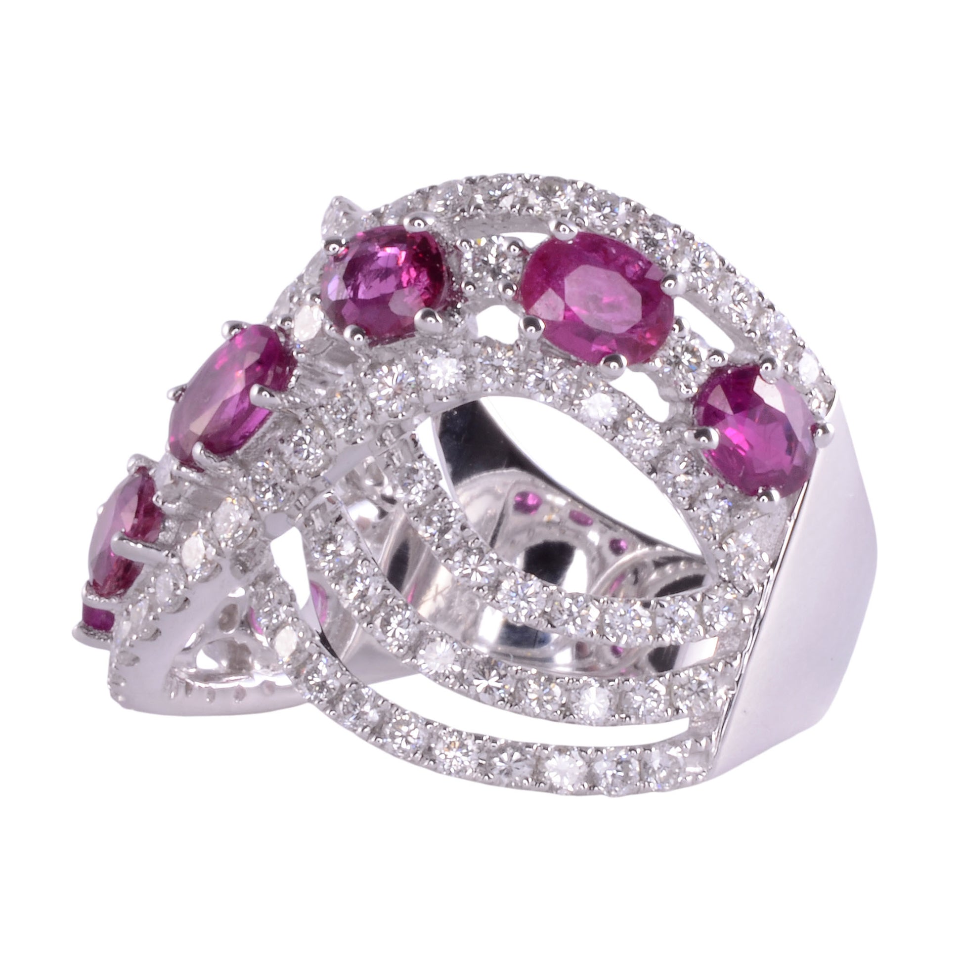 Estate ruby & diamond 18KW wide ring. This 18 karat white gold ring features seven oval rubies at 2.06 carat total weight. The rubies are accented with 1.29 carats of round brilliant diamonds having VS clarity and G-H color. This ruby ring weighs 8.50 grams, is appraised at $5,840, and is a size 6.