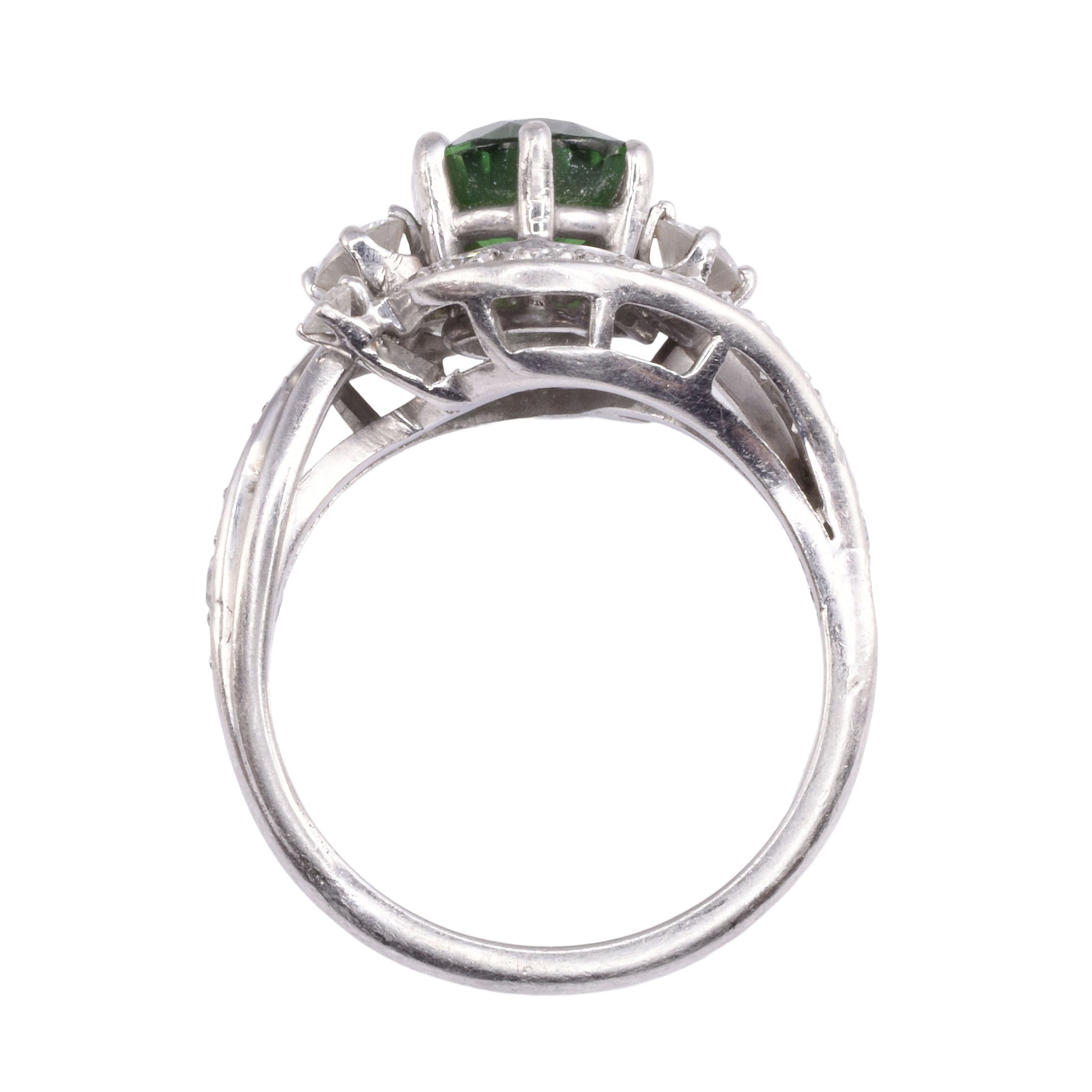 Estate fine quality tsavorite diamond platinum ring. This custom fabricated platinum ring features a 1.61 carat oval tsavorite garnet measuring 7.34mm x 6.55mm, with fine quality and medium green color with strong saturation. It is accented with .72 carat total weight of diamonds having VS2-SI1 clarity and G-H color. This tsavorite garnet ring weighs 7.4 grams, is appraised at $8361, and is a size 5.75. [MHOP KIMH2116P]