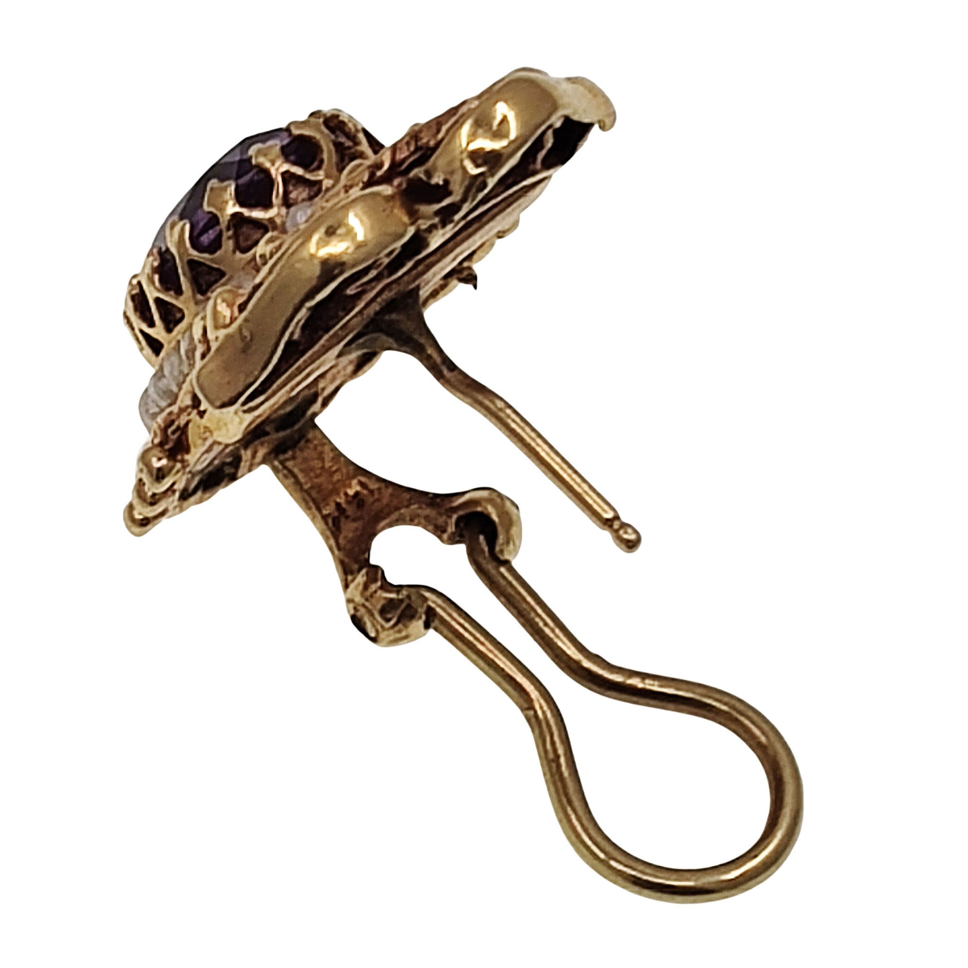 Antique Victorian 14K amethyst & seed pearl earrings, circa 1900. These Victorian earrings are crafted in 14 karat yellow gold and feature 8 x 10mm oval amethysts surrounded by a ring of seed pearls. The Victorian amethyst earrings have omega backs.