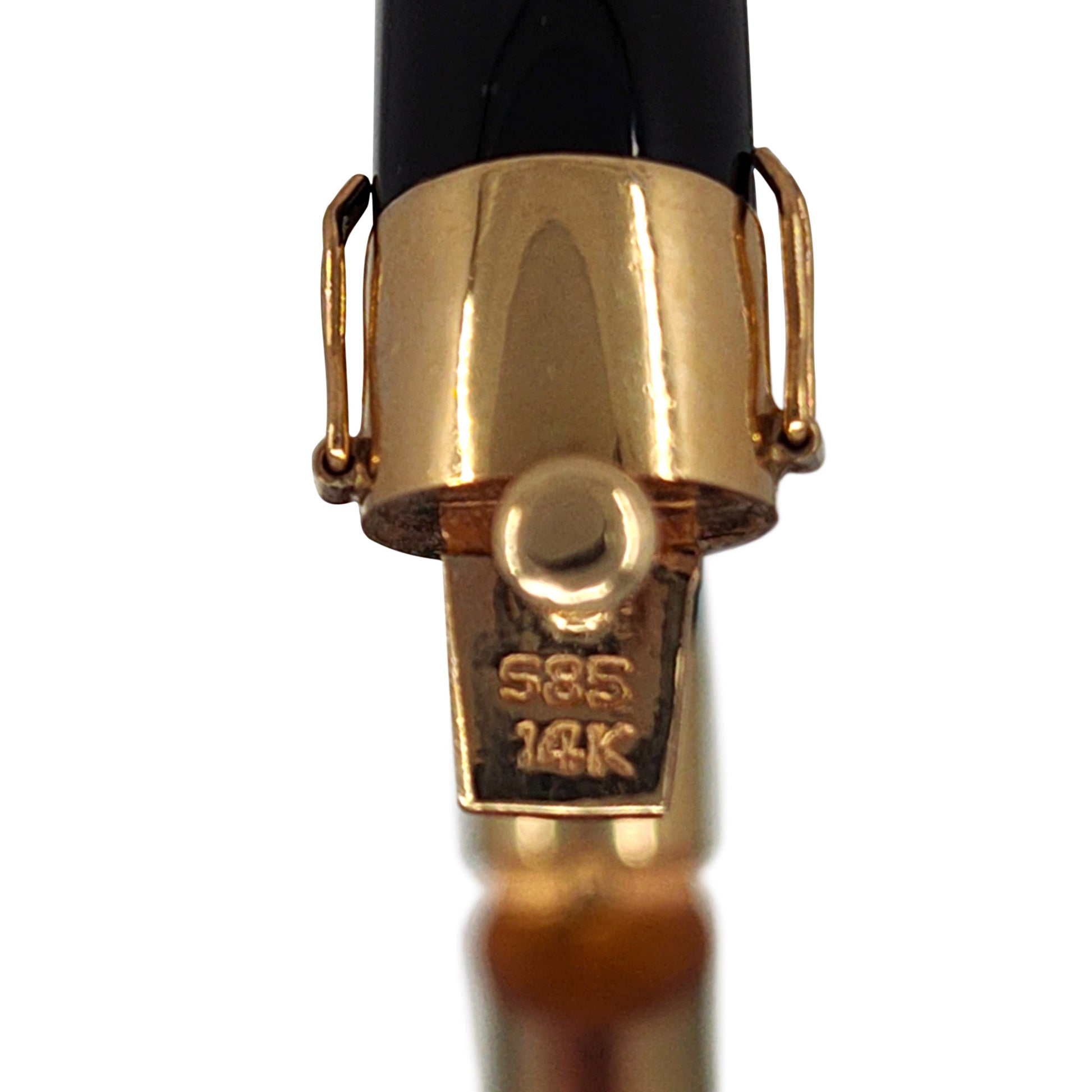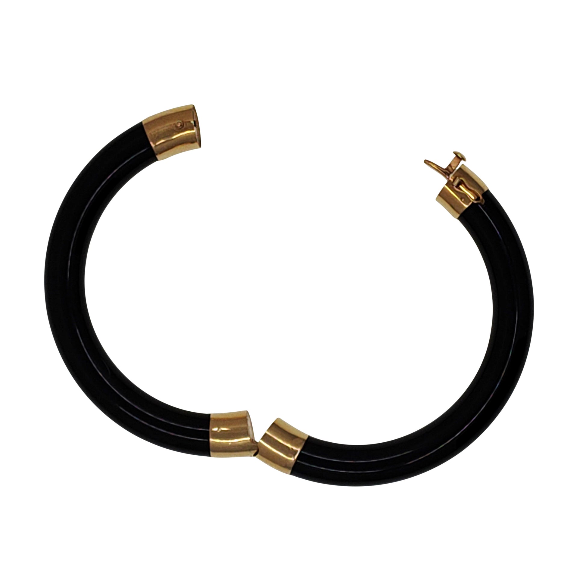 Vintage Gumps black jade hinged bangle bracelet. This hinged bangle bracelet is crafted in carved black jade and 14 karat yellow gold by famed San Francisco maker Gumps. The bangle is marked GUMPS, 585 and 14K. It features dual safety clasps. This vintage Gumps jade bracelet is a fantastic staple for any jewelry wardrobe.